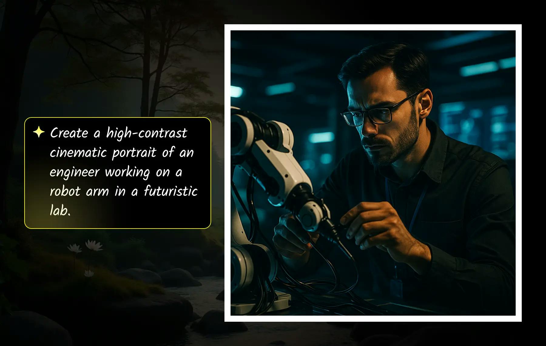 “Create a high-contrast cinematic portrait of an engineer working on a robot arm in a futuristic lab.”